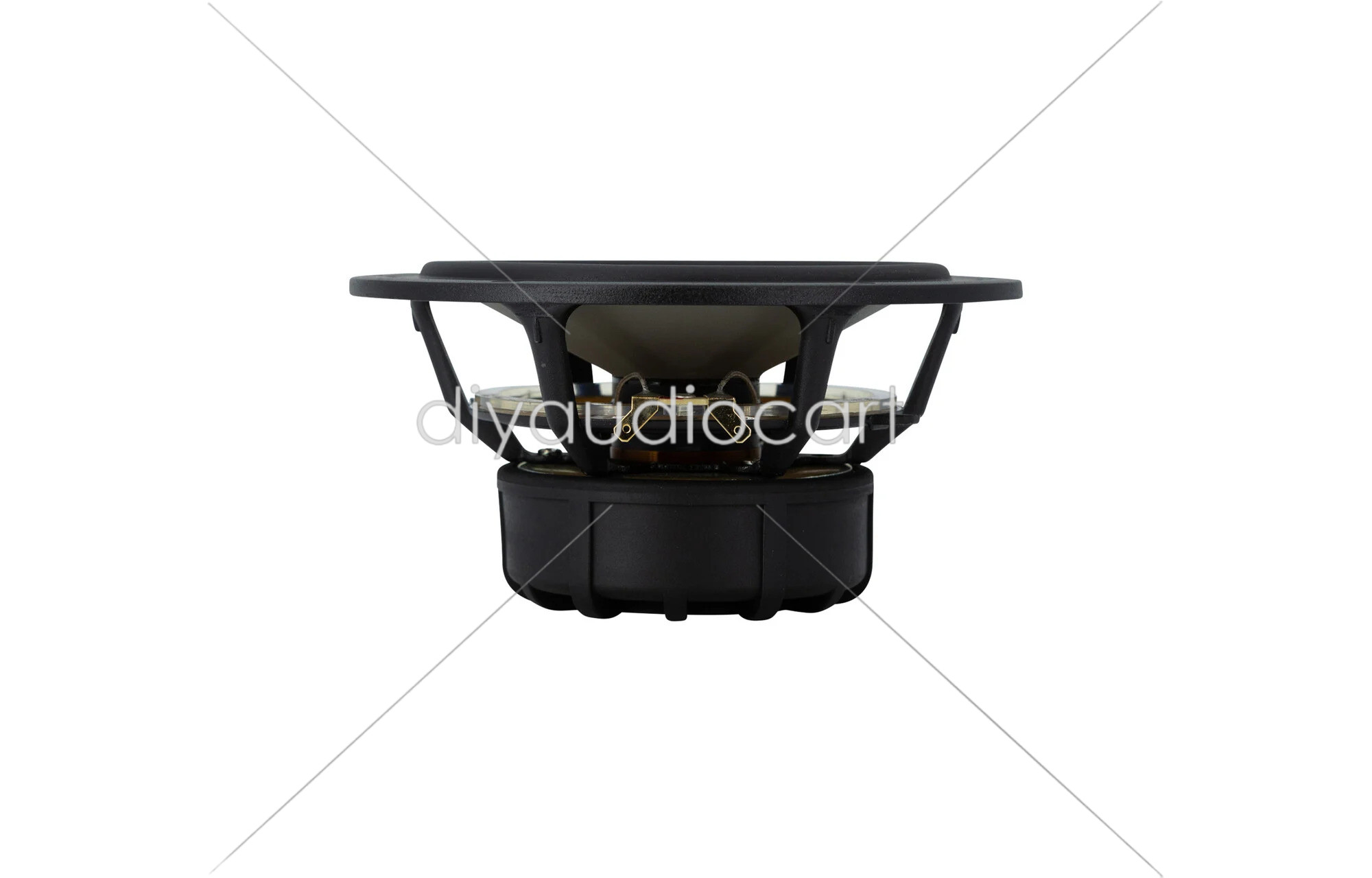 Precision cast and surface treated magnesium cone coupled to a natural rubber surround showing no sign of midrange (edge) resonances. Magnet system with bumped back plate makes room for extreme coil excursions. Heavy copper rings mounted above and below the T-shaped pole piece reduce non linear and modulation distortion and increase overload margin. Extremely stiff and stable injection moulded metal basket keeps the critical components in perfect alignment. Large windows in the basket both above and below the spider reduce sound reflexion, air flow noise and cavity resonance to alminimum. Gold plated terminals mounted on a glass fibre reinforced plate to reduce contact resistance and improve reliability.